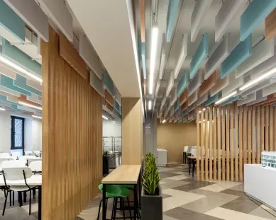 Как видно на фото проектов, линейные светильники подвешивают и на потолок в учебных классах. Например, на этом фото мы видим изогнутый дизайнерский вариант.