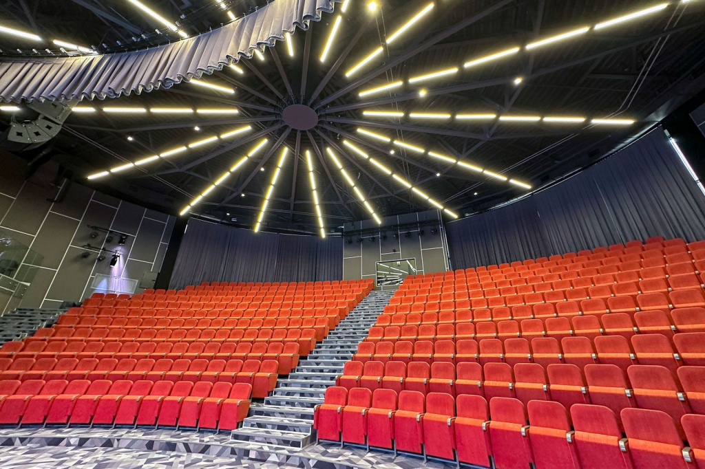 Спот — светильник с дефлектором, который можно повернуть в горизонтальной и вертикальной плоскости. Прибор формирует узкий луч с минимальным рассеиванием.Такие осветительные приборы мы видим на потолке актового зала школы №58. Мощность каждого устройства предположительно составляет 12 Вт. Судя по расположению они нужны для художественного оформления пространства.