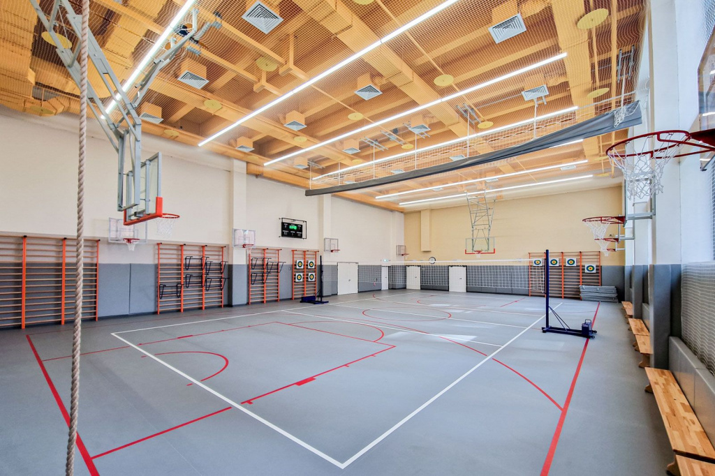 Специалисты компании «МПО Электромонтаж» рекомендует использовать для спортивных залов круглые «промышленные светильники» для высоких пролетов. Их стальные корпуса прочнее пластиковых и алюминиевых. Для защиты рассеивателя необходимо применять решетки.