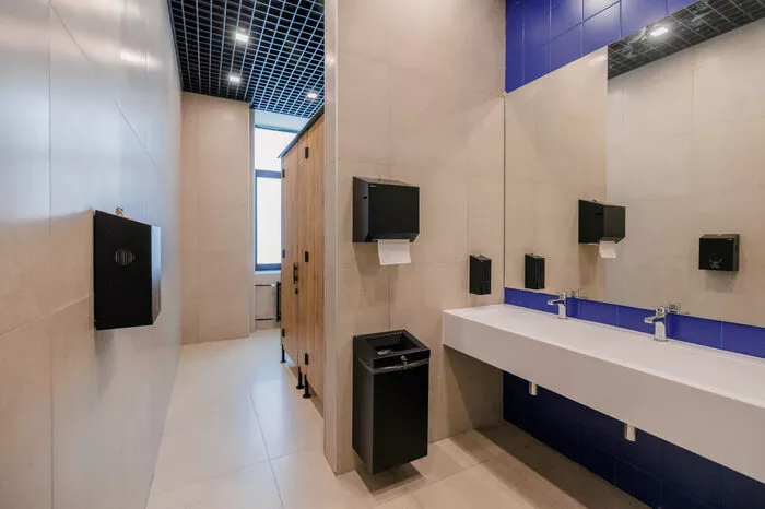 Встраиваемые точечные светильники на представленных проектах использованы в двух типах помещений — в коридорах и в санузлах. В обоих случаях они вмонтированы в подвесной потолок «Грильято» с ячейкой 100x100 мм. Этот тип светильников дает направленный поток света.Светильники-споты