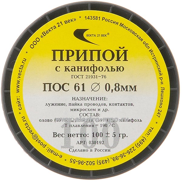 Припой 030192 ПОС-61 Т0,8А 100 г D=0,8мм на катушке с канифолью (Москва)
