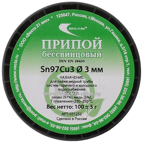 Припой 031252 Sn97Cu3 проволока 3,0 D=3,0мм 100 г на катушке (Москва)