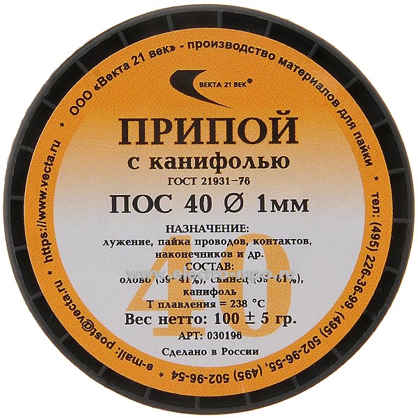 Припой 030196 ПОС-40 Т1А 100 г D=1,0мм на катушке с канифолью (Москва)