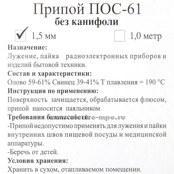 Припой 030324 ПОС-61 проволока 1,5 D=1,5мм L=1м на спирали (Москва)
