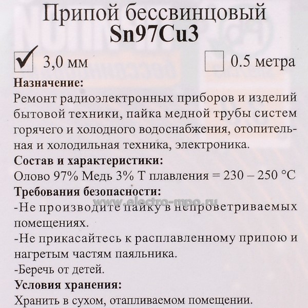 В3391. Припой 031252 Sn97Cu3 проволока 3,0 D=3,0мм 100 г на катушке (Москва)
