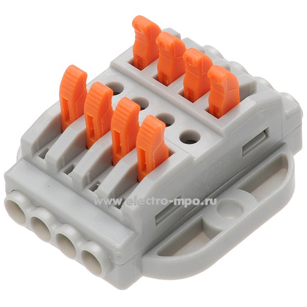 К4398. Зажим VSE-KV223-4Р безвинтовой 4 пары х(0,08-4,0)кв.мм с креп. на поверхность серый (Электромонтаж)