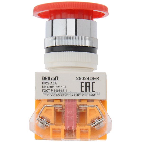 А6129. Выключатель кнопочный ВК22-AEA-RED 25024DEK "Гриб" красный 1з+1р без фиксации (DEKraft)