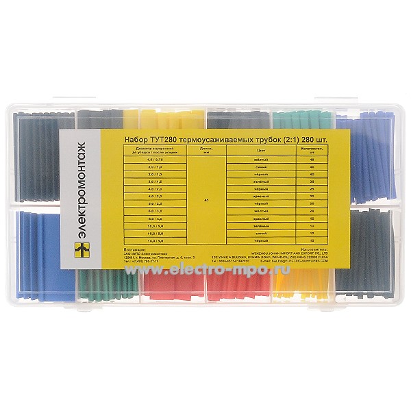 Т3505. Набор ТУТ280 цветных термоусаживаемых трубок (2:1) 280шт (Электромонтаж)
