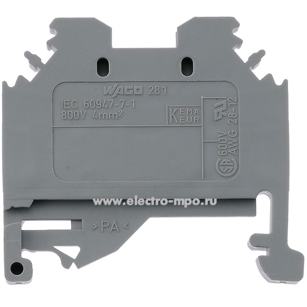 Клемма 281-101 серая боковой монтаж 4мм2 32А 800В ширина 6мм (Wago)