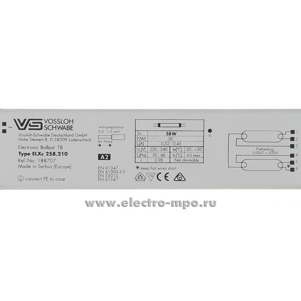 26349.С6349 Дроссель ELXc 258.210 188707 электронный для 2-х ЛЛ 58Вт Т8 (Vossloh Schwabe)