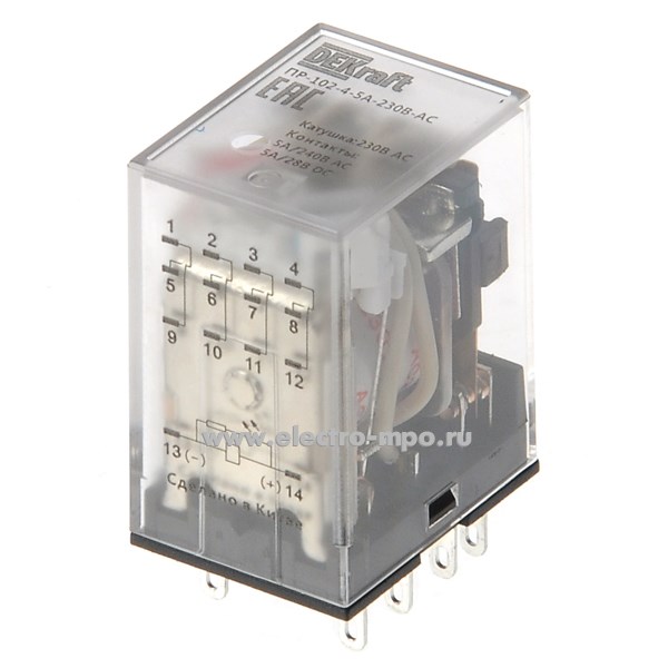 Реле промежуточное ПР-102-4-5A-230В-AC 23900DEK AC230В 5А 4 перекл. контакта LED (DEKraft)