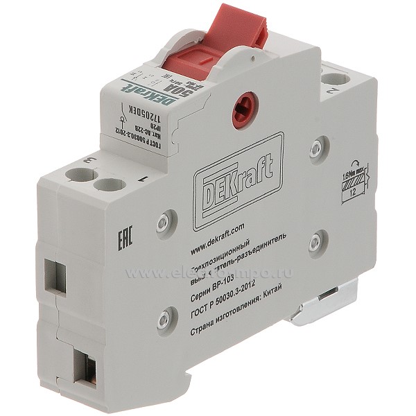 А4862. Переключатель ВР103-1Р-40А 17204DEK /1п/ 40А 3 положения 1 перекл. к-т на Din-рейку (DEKraft)