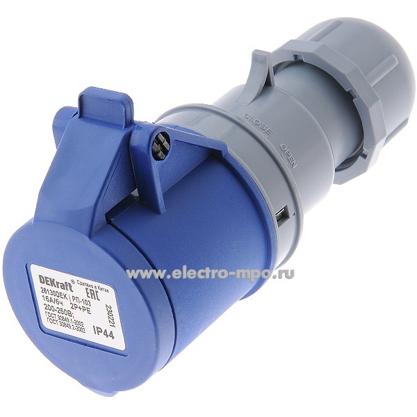 Р4820. Розетка кабельная РП-103 26130DEK 16А 220В 2P+PE IP44 CEE213-6 (DEKraft)