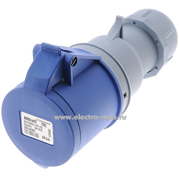 Р4821. Розетка кабельная РП-103 26131DEK 32А 220В 2P+PE IP44 CEE223-6 (DEKraft)